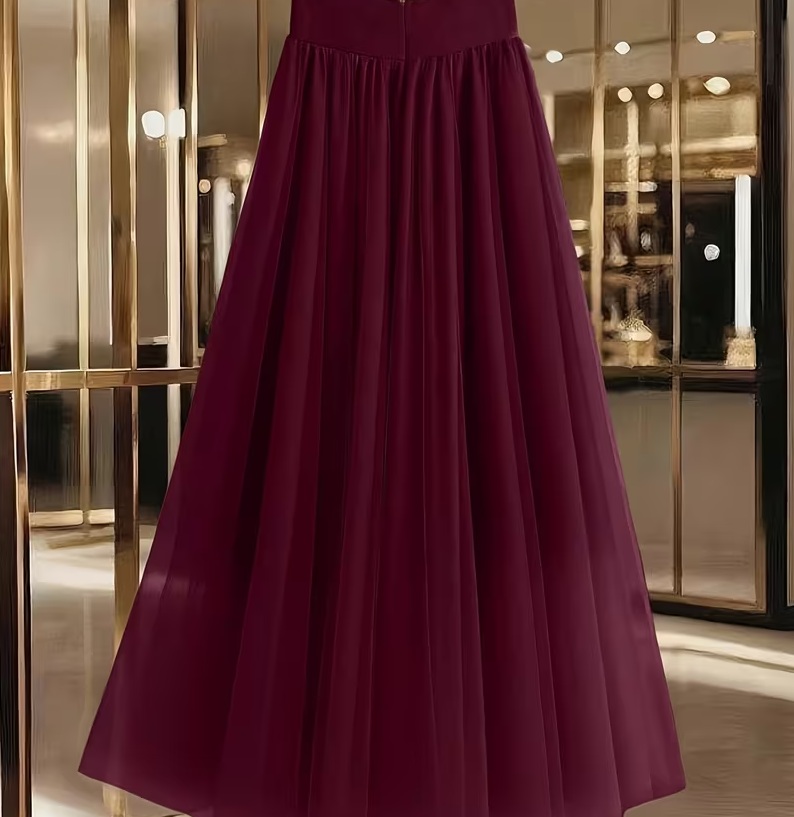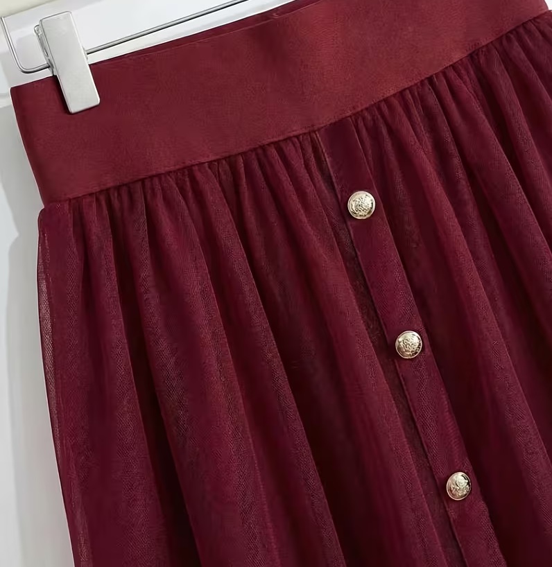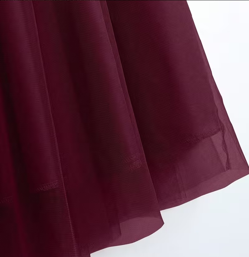 Damska Elegancka Spódnica Plisowana Wysokiej Talii z Aplikacją z Siatki, Jednokolorowa, Bez Paska, Casual na Wiosnę/Jesień, Czerwona